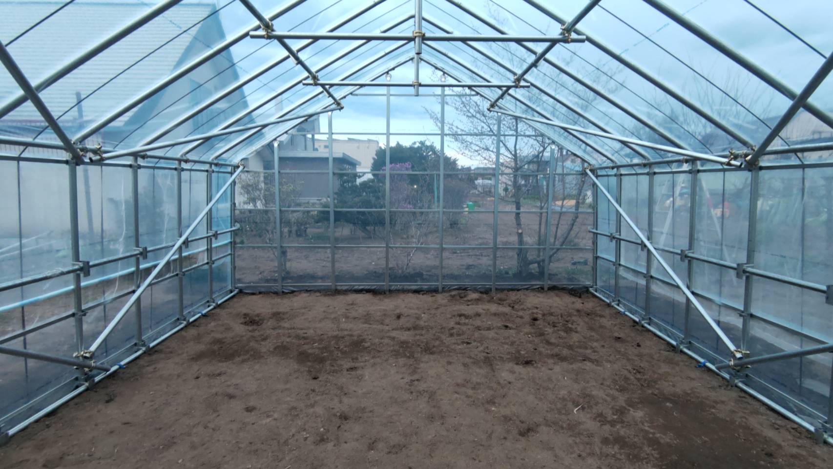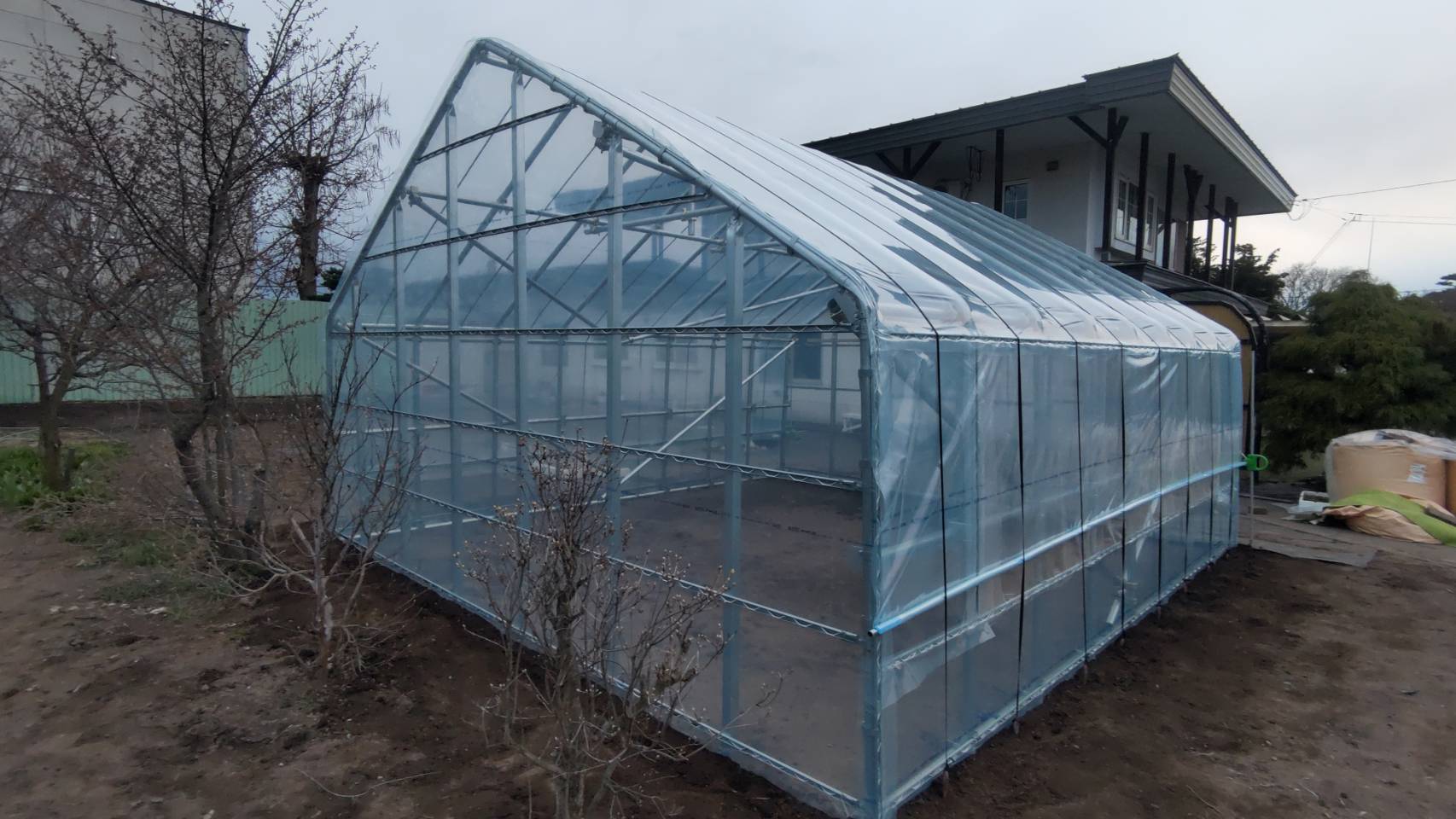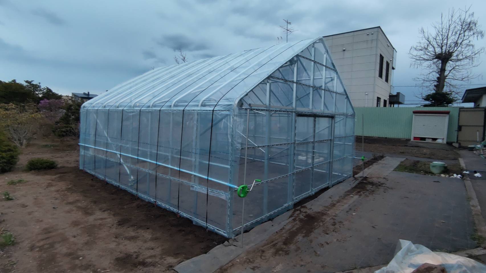 上川郡 東神楽町 雪勝家庭菜園ハウス 施工事例 2025/05/15 施工概要 施工内容 雪勝家庭菜園ハウス 施工 エリア 上川郡東神楽町 使用用途 家庭菜園 面積 間口5.4m×奥行6.0m=32.4㎡(9.8坪) 仕様詳細 主骨材 単管パイプ 48.6φ 軒高 1.8m 褄面 前面:内付け引分戸 W-2000×H-1800 後面:密閉 被覆材 妻面・側面-バツグン5 屋根 バツグン5
